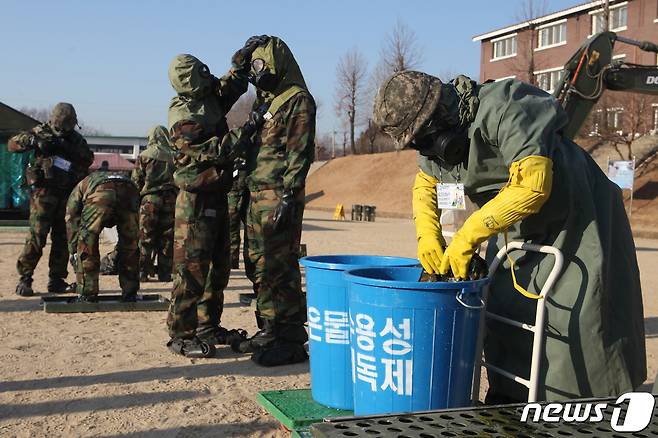 (대구=뉴스1) 최창호 기자 = 육군 제50보병사단 장병들이 21일 주둔지인 대구 북구 모처에서 생화학전에 대비한 훈련을 하고 있다. (육군 제50보병사단제공)2021.1.21/뉴스1