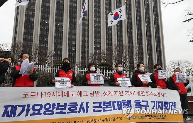 (서울=연합뉴스) 류효림 기자 = 21일 오후 서울 종로구 정부청사 앞에서 열린 재가요양보호사 근본 대책 촉구 기자회견에서 전국요양서비스노조 회원들과 재가요양보호사들이 지원 대책 마련을 촉구하고 있다. 2021.1.21
