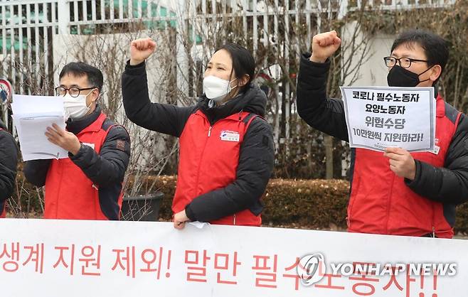 (서울=연합뉴스) 류효림 기자 = 21일 오후 서울 종로구 정부청사 앞에서 열린 재가요양보호사 근본 대책 촉구 기자회견에서 전국요양서비스노조 회원들과 재가요양보호사들이 지원 대책 마련을 촉구하며 구호를 외치고 있다. 2021.1.21