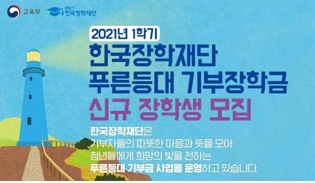 한국장학재단은 법인과 개인에게서 기탁받은 기부금 26억원으로 2021년 1학기 '푸른등대 기부장학금' 신규 장학생을 선발한다고 21일 밝혔다.