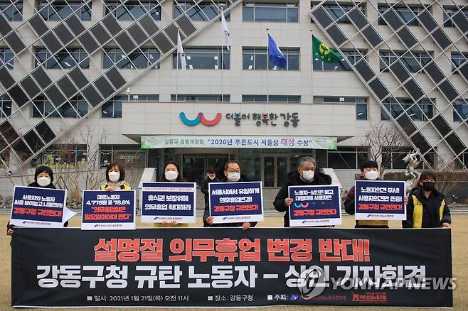 (서울=연합뉴스) 21일 서울 강동구청 앞에서 민주노총 전국서비스산업노동조합연맹, 마트산업노동조합 등 관계자들이 '설 명절 의무휴업 변경 반대 관련 노동자-상인 기자회견'을 하고 있다. 2021.1.21