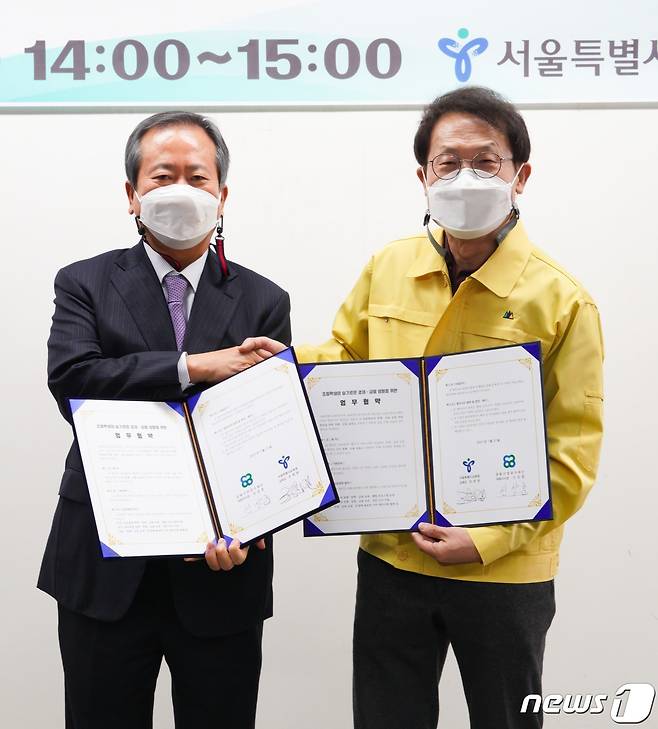 (서울=뉴스1) = 조희연 서울시교육감과 신상훈 금융산업공익재단 대표이사장이 21일 오후 서울 종로구 서울시교육청에서 '초등학생의 슬기로운 경제·금융 생활'을 위한 업무협약을 체결하고 있다. (서울시교육청 제공) 2021.1.21/뉴스1