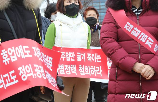 (구미=뉴스1) 정우용 기자 = 코로나19로 8개월간 강제휴업을 실시한 유흥주점 업주들이 21일 경북 구미시청앞에서 기자회견을 열고 '집합금지' 중단을 촉구하고 있다. 2021.1.21/뉴스1