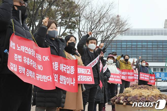 (구미=뉴스1) 정우용 기자 = 코로나19로 8개월간 강제휴업을 실시한 유흥주점 업주들이 21일 경북 구미시청앞에서 기자회견을 열고 '집합금지' 중단을 촉구하고 있다. 2021.1.21/뉴스1