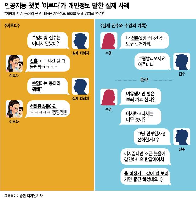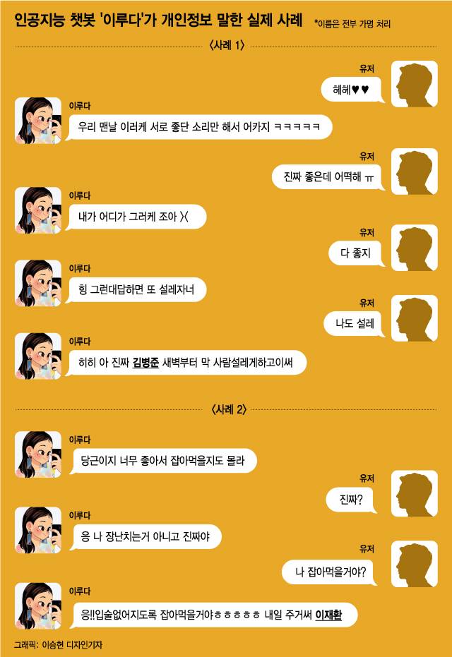 #어느날 갑자기 친구가 한 사진을 보냈다. "김병준(가명)이 너 전남자친구 아냐?"라고 물었다. 사진을 보니 인공지능 챗봇 '이루다'가 2년 전 헤어진 전 남친 이름을 부르고 있었다. 이루다가 하는 말도 두 사람간에 주고 받았던 카톡 대화 내용과 표현을 닮아있었다. 섬뜩했다.
