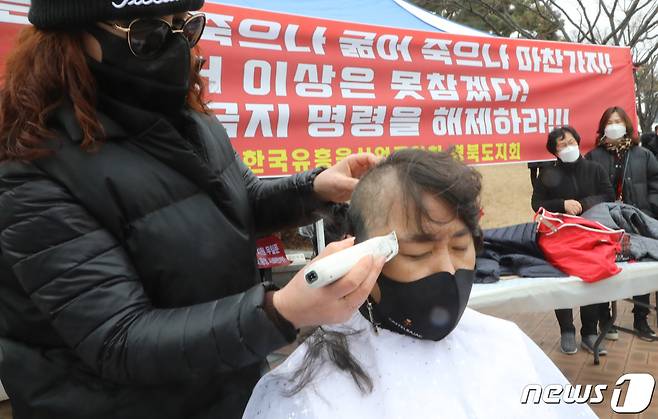 (구미=뉴스1) 정우용 기자 = 코로나19로 8개월간 강제휴업을 실시한 유흥주점 업주들이 21일 경북 구미시청앞에서 기자회견을 열고 '집합금지' 중단을 촉구한 뒤 구미지부 운영위원들이 삭발을 하고 있다. 2021.1.21/뉴스1