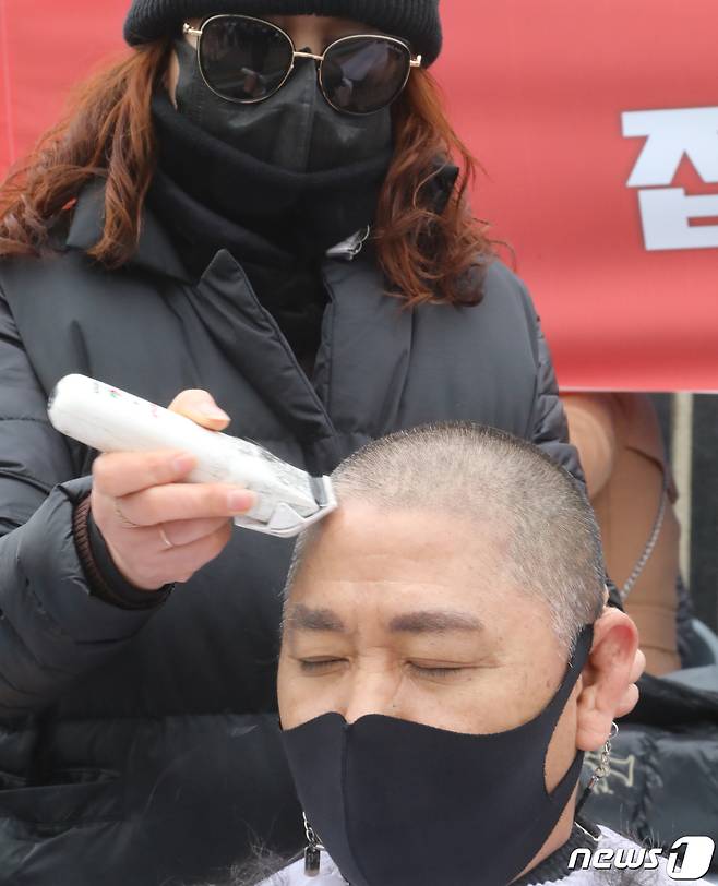 (구미=뉴스1) 정우용 기자 = 코로나19로 8개월간 강제휴업을 실시한 유흥주점 업주들이 21일 경북 구미시청앞에서 기자회견을 열고 '집합금지' 중단을 촉구했다. 행사에 구미지부장과 운영위원들이 삭발을 하고 있다. 2021.1.21/뉴스1