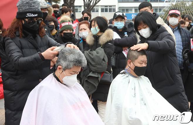 (구미=뉴스1) 정우용 기자 = 코로나19로 8개월간 강제휴업을 실시한 유흥주점 업주들이 21일 경북 구미시청앞에서 기자회견을 열고 '집합금지' 중단을 촉구했다. 행사에 구미지부장과 운영위원들이 삭발을 하고 있다. 2021.1.21/뉴스1