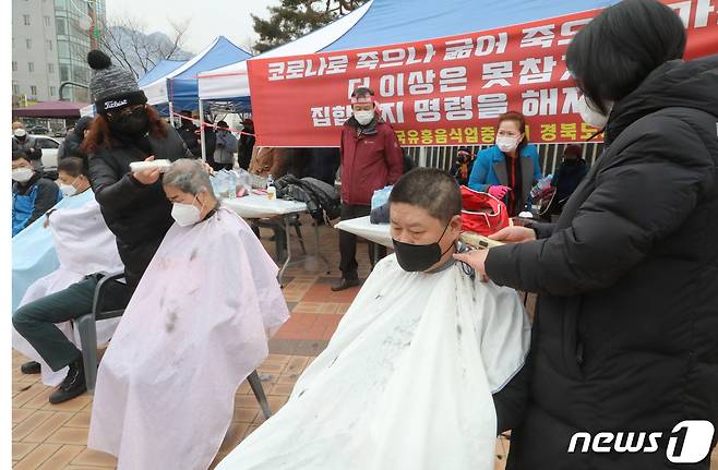 (구미=뉴스1) 정우용 기자 = 코로나19로 8개월간 강제휴업을 실시한 유흥주점 업주들이 21일 경북 구미시청앞에서 기자회견을 열고 '집합금지' 중단을 촉구했다. 행사에 구미지부장과 운영위원들이 삭발을 하고 있다. 2021.1.21/뉴스1