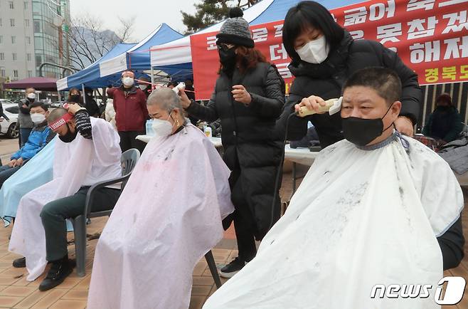 (구미=뉴스1) 정우용 기자 = 코로나19로 8개월간 강제휴업을 실시한 유흥주점 업주들이 21일 경북 구미시청앞에서 기자회견을 열고 '집합금지' 중단을 촉구했다. 행사에 구미지부장과 운영위원들이 삭발을 하고 있다. 2021.1.21/뉴스1