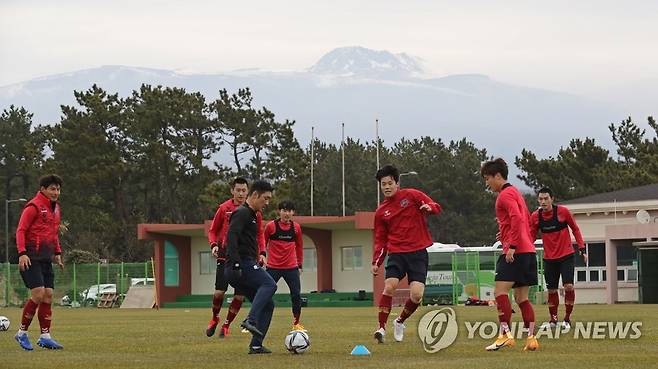 (서귀포=연합뉴스) 박지호 기자 = 프로축구 K리그1 수원FC 선수들이 21일 오후 제주 서귀포시 중문단지축구장에서 훈련하고 있다. 2021.1.21