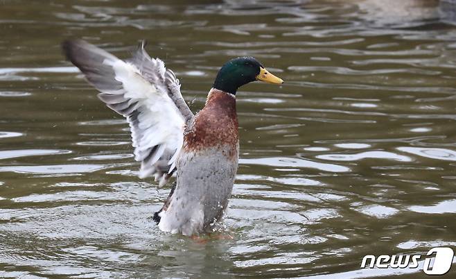 (대전=뉴스1) 김기태 기자 = 21일 오후 대전 유성구 한국과학기술원(KAIST) 캠퍼스 연못에서 청둥오리가 몸 단장을 하고 있다. 2021.1.21/뉴스1