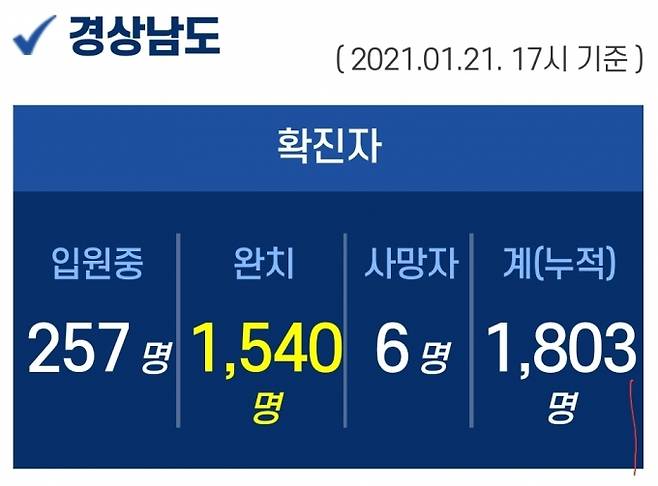 21일 오후 5시 기준, 경남도내 입원 중인 확진자는 257명이고, 퇴원 1540명, 사망 6명, 누적 확진자는 총 1803명이다.
