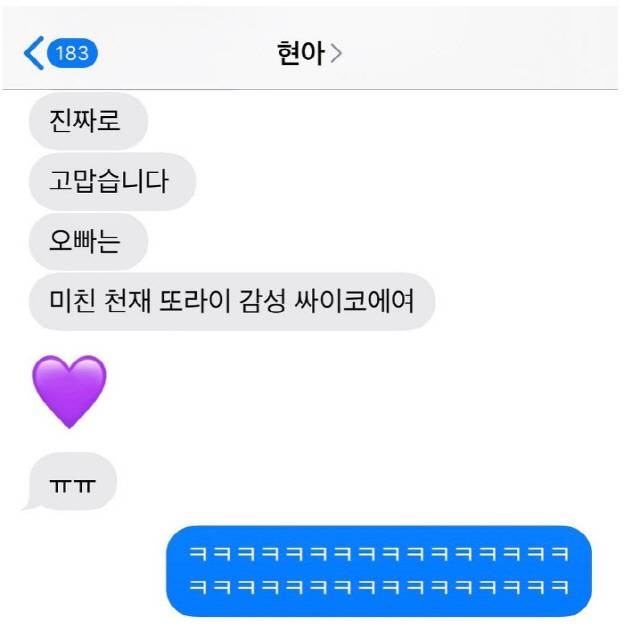 먼저 현아가 싸이에게 "진짜로 고맙습니다. 오빠는 미친 천재 또라이 감성 싸이코에요"라며 박력 넘치는 칭찬을 했고, 싸이는 "ㅋㅋㅋㅋㅋㅋㅋ" 웃음으로 답장, 흡족한 마음을 표했다.