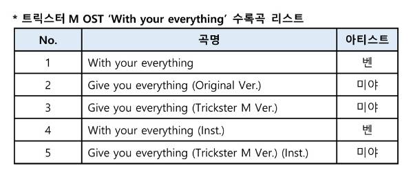 엔씨(NC)는 앨범에 5곡을 담았다. 타이틀 곡인 'With your Everything'은 원작 '트릭스터'의 6번째 에피소드 OST 'Give you Everything'을 새롭게 편곡했다. 솔로 보컬리스트 벤(BEN)이 노래했다. 편곡은 프로듀싱 팀 VIP(Vibe In Play)가 맡았다. 벤이 직접 출연한 뮤직비디오 풀 버전(Full Version)은 '트릭스터M' 브랜드 사이트와 공식 유튜브 채널 '드릴 월드'에서 볼 수 있다.