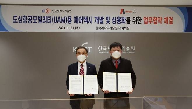 세라믹기술원과 (주)엔젤럭스는 세라믹기술원 대회의실에서 도심항공모빌리티(UAM, Urban Air Mobility)용 에어택시 개발 및 상용화를 위한 업무협약을 체결했다.