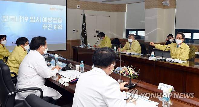 (서울=연합뉴스) 김희겸 행정안전부 재난안전관리본부장이 21일 오후 코로나19 감염 및 확산 방지를 위해 광주보훈병원 대응 현장을 방문해 예방접종 준비상황에 대해 당부의 말을 전하고 있다. 2021.1.21