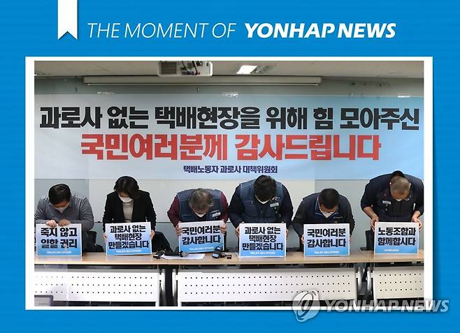 (서울=연합뉴스) 신준희 기자 = 택배업계 노사가 택배 노동자 과로사 방지를 위한 분류작업 책임 문제 등에 대해 최종 합의한 21일 서대문구 전국서비스산업노동조합연맹에서 열린 택배노동자 과로사 대책위원회 기자회견에서 참석자들이 감사 인사를 하고 있다. 2021.1.21 [THE MOMENT OF YONHAPNEWS]