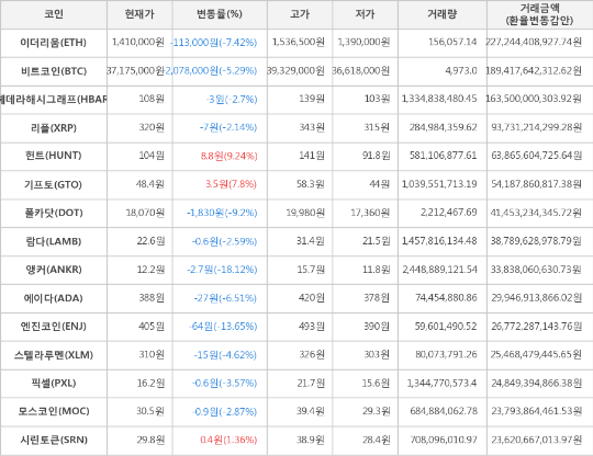 가상화폐 비트코인(-5.29%), 헌트(+9.24%)
