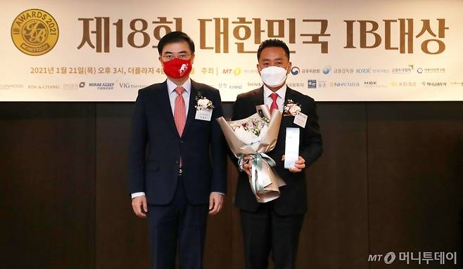 김중곤 NH투자증권 ECM본부장(오른쪽)이 21일 오후 서울 중구 더 플라자에서 열린 머니투데이 주최 '제18회 대한민국 IB대상 시상식'에서 최우수 ECM 주관사 한국거래소 이사장상을 수상한 뒤 손병두 한국거래소 이사장과 기념촬영을 하고 있다.