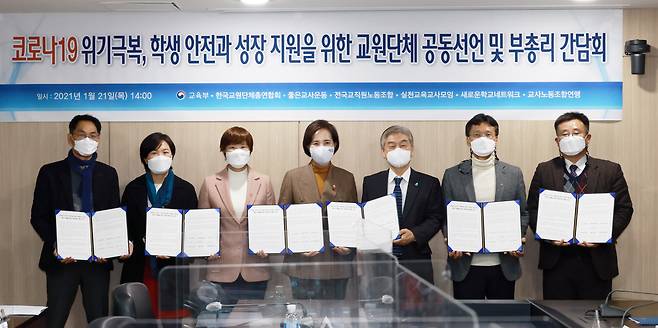 유은혜 교육부장관은 인사말에서 '등교수업이 위험하지 않았다'는 정은경 질병관리청장의 논문을 인용했고, 교원단체들은 "상시적인 거리두기를 위한 과밀학급 해소에 나서달라"는 내용을 담은 공동선언문을 발표했다. 교육부장관과 교원 6단체 대표가 만나 올해 등교수업 확대에 대한 기대를 나타낸 것이다.