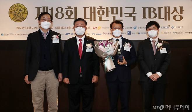 법무법인 세종 박용진, 이석, 양현근 변호사가 21일 오후 서울 중구 더 플라자에서 열린 머니투데이 주최 '제18회 대한민국 IB대상 시상식'에서 최우수 혁신상품설계 자문사 금융투자협회장상을 수상한 뒤 나재철 금융투자협회장과 기념촬영을 하고 있다.
