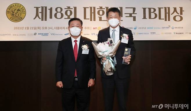 김광일 MBK파트너스 대표가 21일 오후 서울 중구 더 플라자에서 열린 머니투데이 주최 '제18회 대한민국 IB대상 시상식'에서 최우수 PEF 펀드레이징 리더 금융투자협회장상을 수상한 뒤 나재철 금융투자협회장과 기념촬영을 하고 있다.
