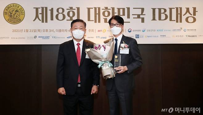 이상호 글랜우드PE 대표가 21일 오후 서울 중구 더 플라자에서 열린 머니투데이 주최 '제18회 대한민국 IB대상 시상식'에서 최우수 PEF 퍼포먼스 리더 금융투자협회장상을 수상한 뒤 나재철 금융투자협회장과 기념촬영을 하고 있다.