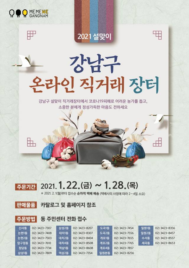 서울 강남구는 코로나19로 어려움을 겪는 농가를 돕기 위해 ‘설맞이 온라인 직거래장터’를 열고 오는 28일까지 사전주문을 받는다.