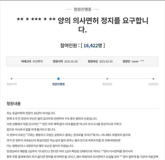 작성자는 "(조 전 장관의 부인) 정경심씨의 재판이 끝날 때까지라도 의사 면허를 정지시켜 조 전 장관과 이 정부의 지지자들이 아닌 대한민국 모든 사람의 도덕적 공감을 얻고 사회적 박탈감이 생기지 않도록 조치해달라"고 덧붙였다.