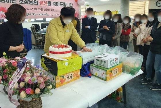 보건소 직원 10여 명이 지난 15일 보건소에 모여 보건소장 생일을 축하하는 사진이었다.
