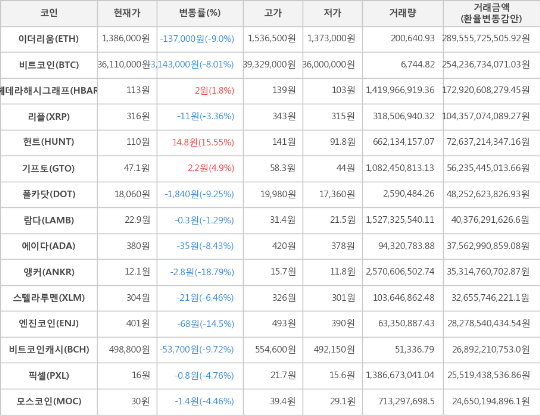 또한, 엔진코인(-14.5%, 401원), 비트코인캐시(-9.72%, 498,800원), 폴카닷(-9.25%, 18,060원), 이더리움(-9.0%, 1,386,000원), 에이다(-8.43%, 380원), 스텔라루멘(-6.46%, 304원), 픽셀(-4.76%, 16원), 모스코인(-4.46%, 30원), 리플(-3.36%, 316원), 람다(-1.29%, 22.9원)가 하락세를 나타냈다.