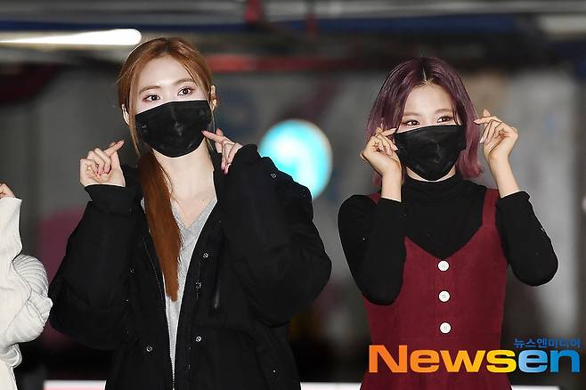 체리블렛(Cherry Bullet) 멤버 메이와 레미가 방송국으로 들어서고 있다.