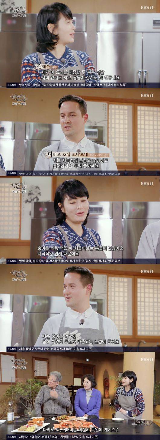 다리오가 직접 만든 한국식 소시지와 함께 한상이 마련됐다. 파독 간호사였던 한국인 어머니와 독일인 아버지 사이에서 태어났다는 다리오는 "독일에 있는 어머니 항상 걱정해, 어머니와 똑같은 마음으로 한국에 잘 정착해 자랑스러운 아들이 되고 싶다"고 말해 김혜수를 뭉클하게 했다.