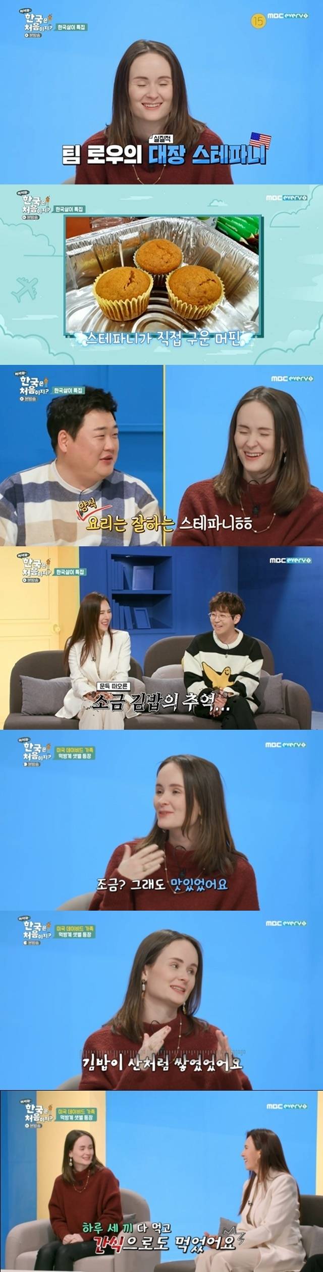 이날 미국 공군 출신 데이비드의 아내 스테파니는 ‘어서와’ 스튜디오에 첫 출연했다. 특히 스테파니는 MC들을 위해 머핀을 직접 구워와 선물했다. 이에 딘딘은 “소금김밥이 생각나 뭘 고를까 한참 고민했다”며 웃었다. 스테파니는 지난 방송에서 김밥 만들기에 도전했고, 모든 재료마다 소금을 잔뜩 뿌린 소금김밥을 만들어 시청자들을 경악케 했다.