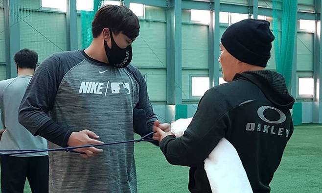 | 제주서 개인훈련 토론토 류현진(왼쪽)이 제주에서 트레이너와 함께 개인훈련을 하고 있다. 에이스펙코퍼레이션 인스타그램 캡처 |