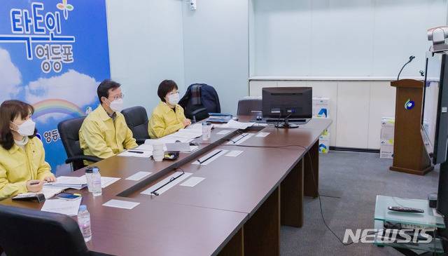 [서울=뉴시스]박미소 기자 = 채현일(가운데) 영등포구청장이 21일 오전 서울 영등포구청에서 영상회의로 개최된 제156차 서울특별시구청장협의회 정기회의에 참석하고 있다.(사진=영등포구청 제공)2021.01.21. photo@newsis.com