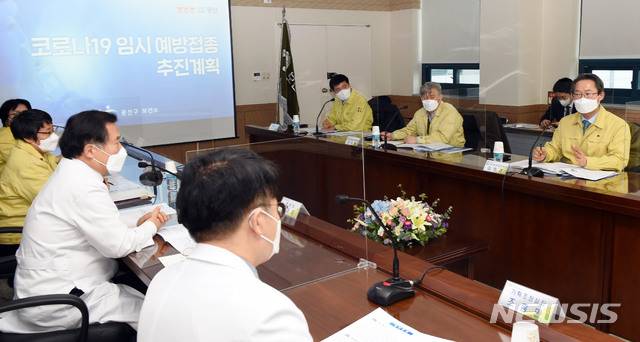[서울=뉴시스]박미소 기자 = 김희겸 행정안전부 재난안전관리본부장이 21일 오후 신종 코로나바이러스 감염증(코로나19) 백신 예방접종 센터로 운영 예정인 광주 광산구 광주보훈병원 체육관을 방문해 관계자들에게 격려의 말을 전하고 있다.(사진=행정안전부 제공)2021.01.21. photo@newsis.com