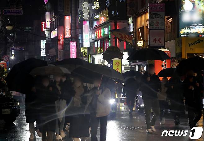 (서울=뉴스1) 이동해 기자 = 21일 서울 시내의 유흥주점 밀집지역에서 저녁 9시가 되자 거리로 쏟아지는 시민들과 가게 문을 닫은 채 간판 불을 켜는 '점등 시위'가 이어지고 있다. 2021.1.21/뉴스1