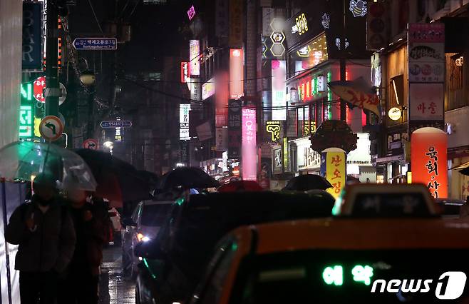 (서울=뉴스1) 이동해 기자 = 21일 서울 시내의 유흥주점 밀집지역에서 저녁 9시가 되자 거리로 쏟아지는 시민들과 가게 문을 닫은 채 간판 불을 켜는 '점등 시위'가 이어지고 있다. 2021.1.21/뉴스1