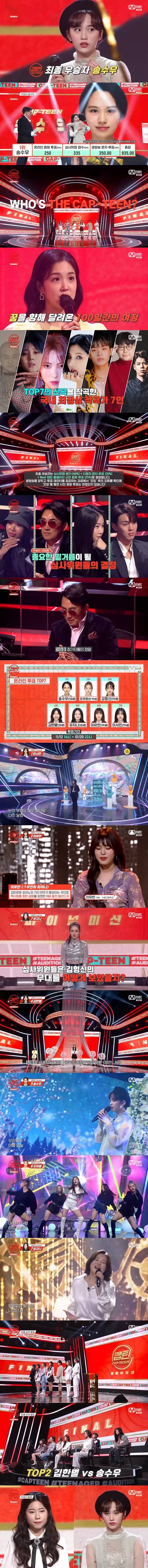 21일 밤 방송된 케이블채널 엠넷(Mnet) '캡틴(CAP-TEEN)' 파이널에서는 최후의 1인 '캡틴' 자리를 놓고 대결하는 김한별, 김형신, 송수우, 유지니, 이서빈, 이유빈, 조아영 등 TOP7의 무대가 그려졌다.