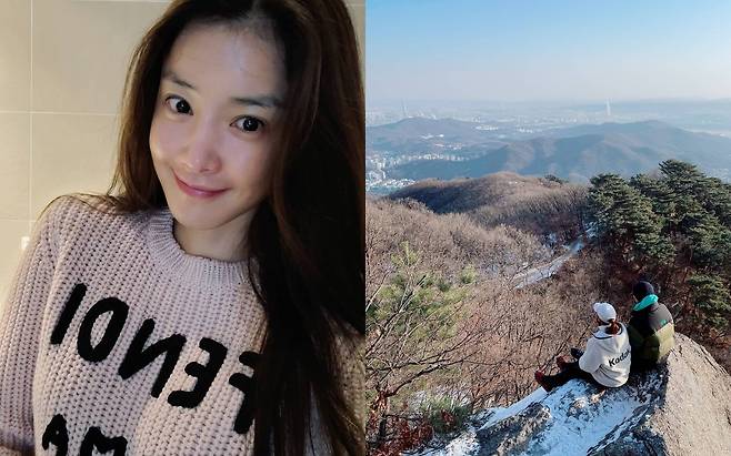 사진 속에는 아찔한 산 정상에서 기울어진 바위에 앉아 탁 트인 풍경을 바라보는 이시영과 션의 뒷 모습이 담겨있다. 눈이 내려 더욱 미끄러운 산길임에도 두 사람은 여유로운 모습을 보였다.