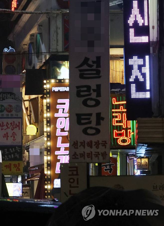 (서울=연합뉴스) 홍해인 기자 = 21일 밤 유흥시설들이 들어선 서울 송파구 잠실새내역 인근 거리에 밤 9시가 넘어 간판 불을 밝힌 업소들이 보이고 있다.