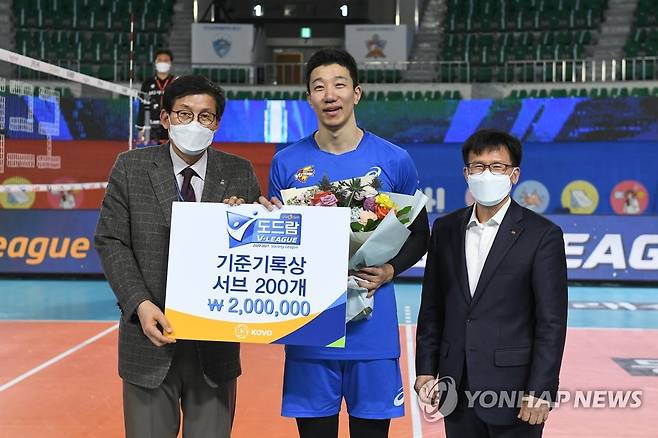 (서울=연합뉴스) 21일 대전충무체육관에서 열린 도드람 2020-2021 V-리그 한국전력과 삼성화재의 경기에서 서브 200개 기준기록상을 달성한 한국전력 신영석(왼쪽 두번째)이 김건태 경기운영본부장(왼쪽 첫번째), 박창용 한국전력 총괄단장과 기념촬영을 하고 있다. 2021.1.21 [한국전력배구단 제공. 재판매 및 DB 금지]