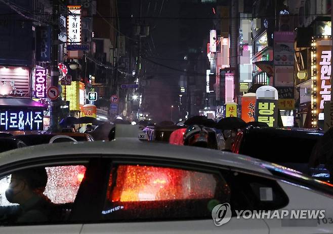 (서울=연합뉴스) 홍해인 기자 = 21일 밤 유흥시설들이 들어선 서울 송파구 잠실새내역 인근 거리에 밤 9시가 넘어 간판 불을 밝힌 업소들 사이로 시민들이 귀가하고 있다.
