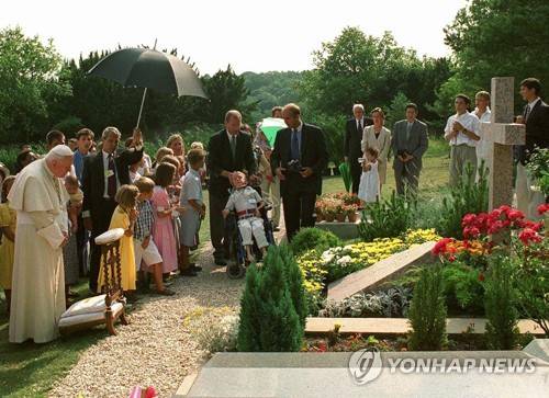 FILE - In this Aug.22, 1997 file photo, Pope John Paul II meditates by the grave of his former friend geneticist Jerome Lejeune, during a private visit to the Chalo-Saint-Mars cemetery near Paris. Pope Francis on Thursday, Jan. 21, 2021, approved the “heroic virtues” of Dr. Jerome Lejeune, who discovered the genetic basis of Down syndrome, lived from 1926-1994 and was particularly esteemed by St. John Paul II for his anti-abortion stance. (AP Photo/Arturo Mari/file) POOL - AUG.22, 1997 FILE PHOTO