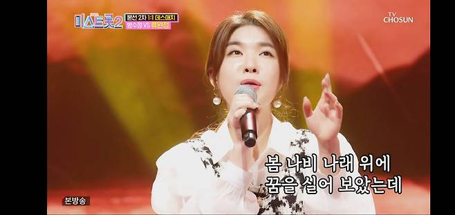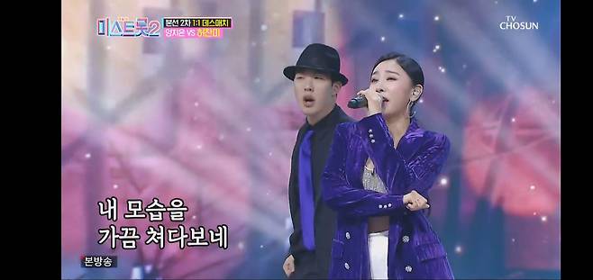 이에 맞서는 장태희는 머리부터 온몸이 ‘정통 DNA’라고 소개한뒤 유지나의 ‘무슨 사랑’을 꺼내들었다. 금빛 드레스로 관능미를 뿜은 그녀는 날선 트로트 감성으로 리듬을 탔다.