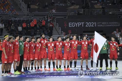 epa08955574 Players of Japan line up prior to the Main Round match between Japan and Argentina at the 27th Men's Handball World Championship in Cairo, Egypt, 21 January 2021. EPA/Anne-Christine Poujoulat / POOL