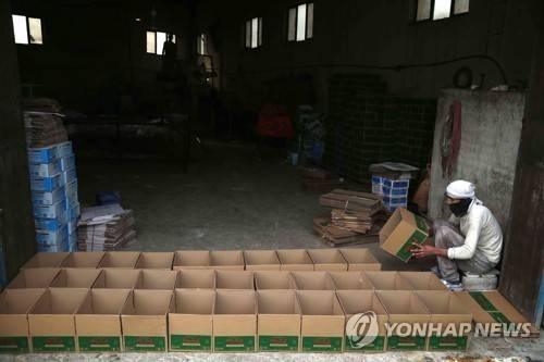 epa08955591 An Afghan laborer prepares boxes at a factory that produces washing powder and soap in Jalalabad, Afghanistan, 21 January 2021. The factory produces around 1.5 Tons of Washing powder and around 5,000 packets of soap during the day. EPA/GHULAMULLAH HABIBI
