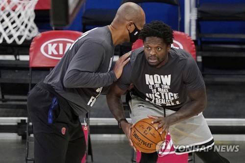 New York Knicks forward Julius Randle works with a trainer during pregame warmups before an NBA basketball game against the Orlando Magic, on Monday, Jan. 18, 2021, in New York. (AP Photo/Kathy Willens)